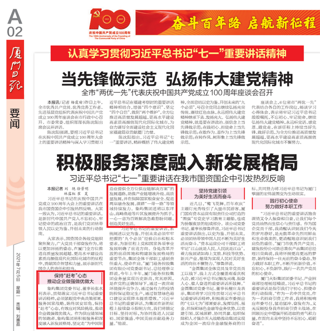 7月5日,《厦门日报》以《积极服务深度融入新发展格局》为题,报道我市国资国企系统学习贯彻情况,突出报道了尊龙集团党委书记、董事长张水利的学习心得。
